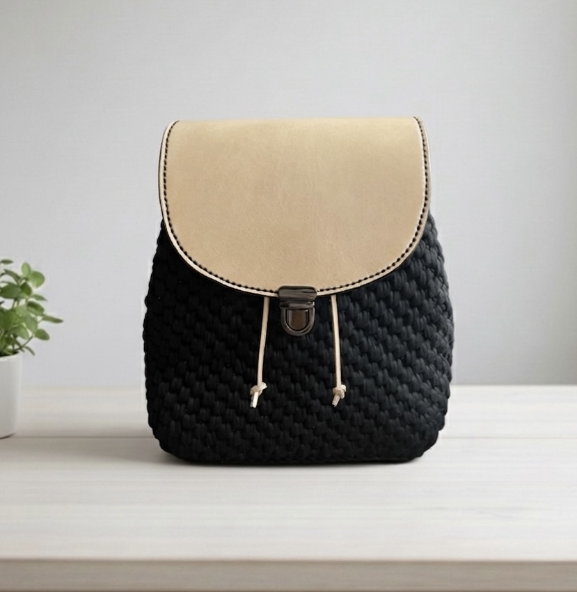 Tělo batohu je poctivě uháčkované, díky čemuž pevně drží svůj tvar a je velmi odolné. Celkový design je podtržen elegantním černým kováním a výraznou přední sponou, která batůžek bezpečně uzavírá.