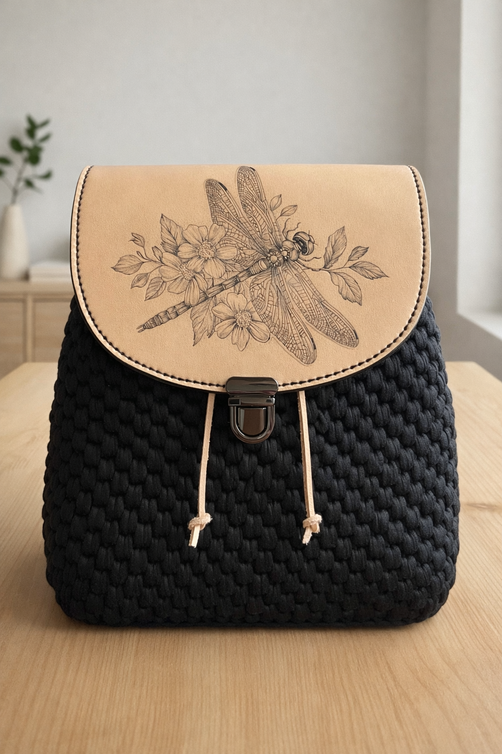 Tělo batohu je poctivě uháčkované, díky čemuž pevně drží svůj tvar a je velmi odolné. Celkový design je podtržen elegantním černým kováním a výraznou přední sponou, která batůžek bezpečně uzavírá.