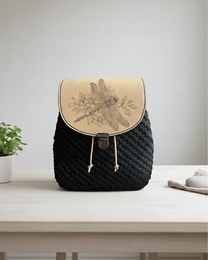 Hlavní dominantou je kožená klopa z prémiové třísločiněné hověziny, kterou zdobí autorský motiv vážky a květin. Tento motiv není natištěný – je do kůže ručně vytetovaný. Klopa bude navíc nošením přirozeně pracovat a získávat krásnou patinu, čímž batůžek získá ještě větší osobitost.