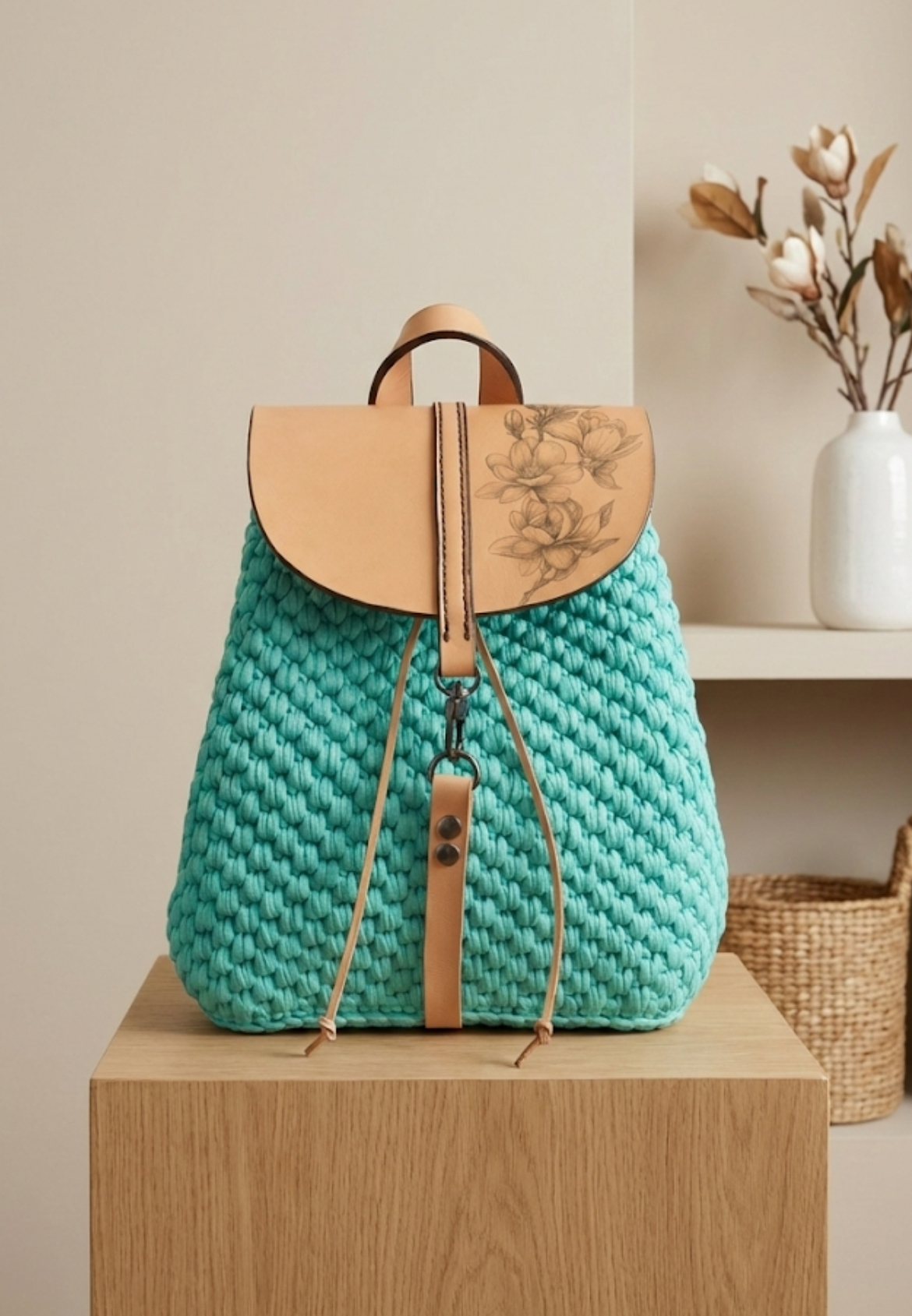 Představujeme vám exkluzivní, ručně háčkovaný batůžek, který kombinuje precizní řemeslnou práci s jemným, nadčasovým designem. Tato varianta v tyrkysovém tónu s motivem květů magnolie je hotovým klenotem pro každodenní nošení.