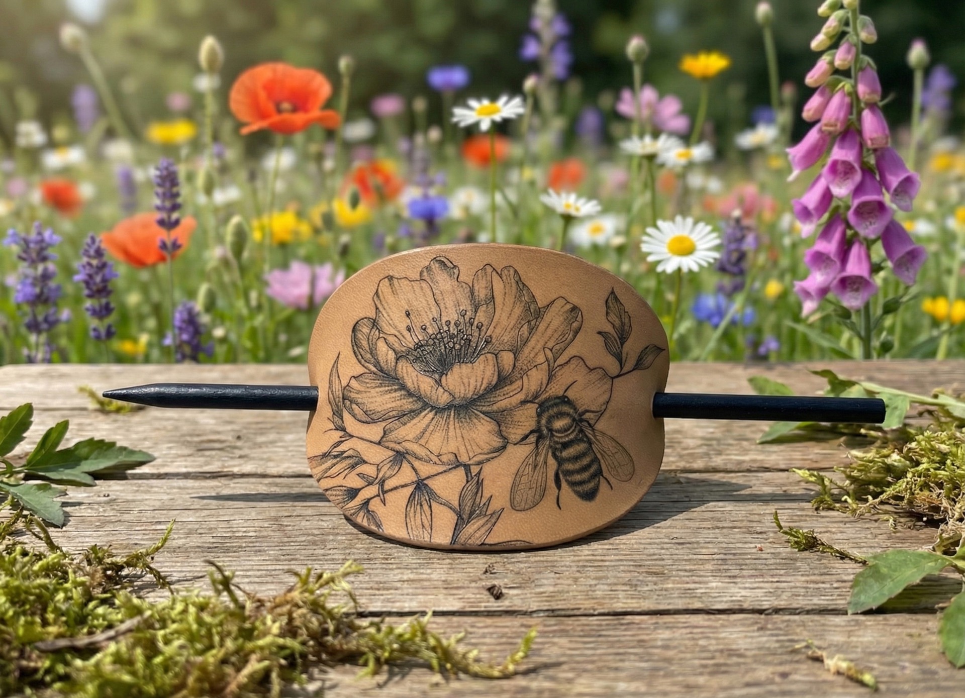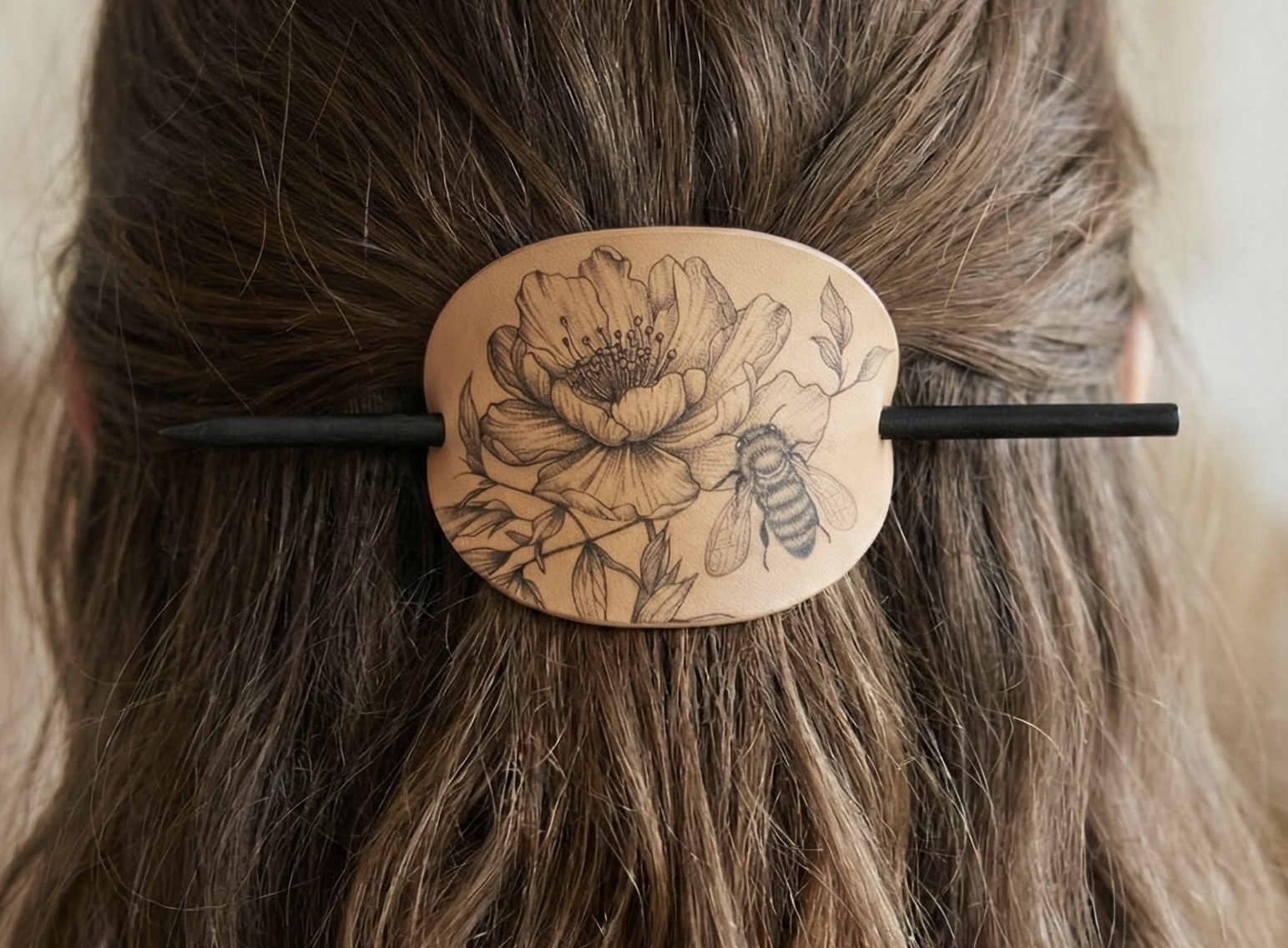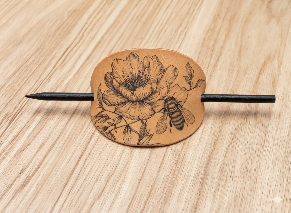 Ústředním motivem je detailní kresba rozkvetlé pivoňky a včelky, která je do kůže ručně vtetovaná. Spona je doplněna elegantní černou dřevěnou jehlicí, která vytváří krásný kontrast se světlou usní a bezpečně udrží váš účes na svém místě.