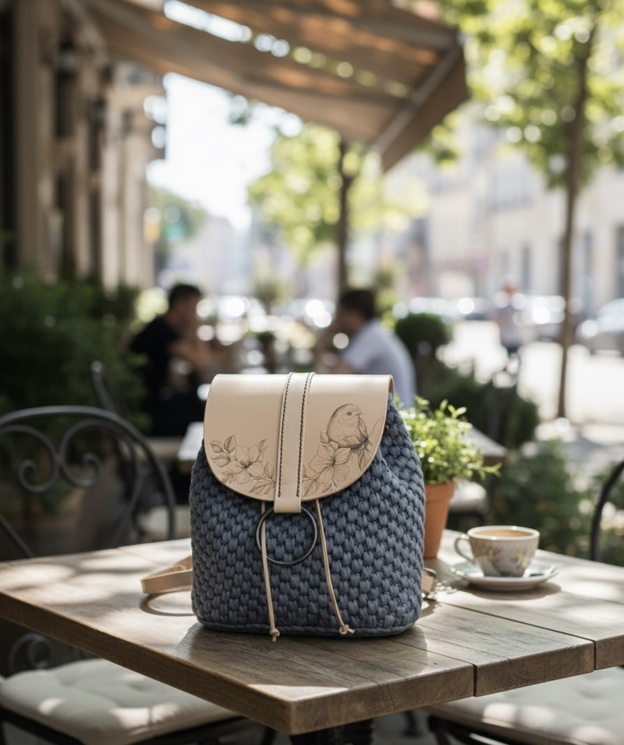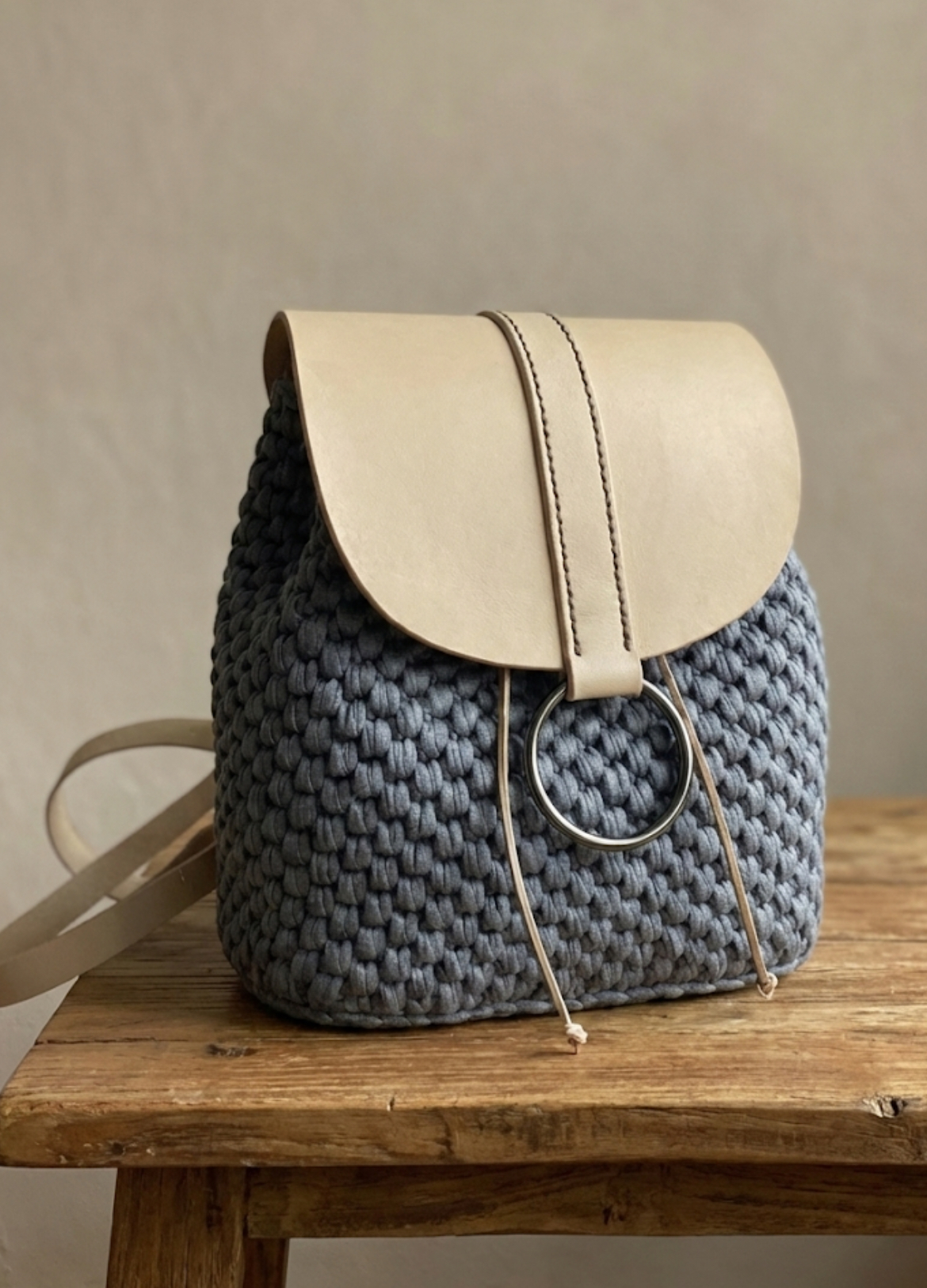 Tělo batohu: Precizně ručně háčkováno s možností výběru barvy příze z naší nabídky (např. na obrázku je šedá). Získáte tak jedinečnou texturu a barvu přesně podle vašich představ.