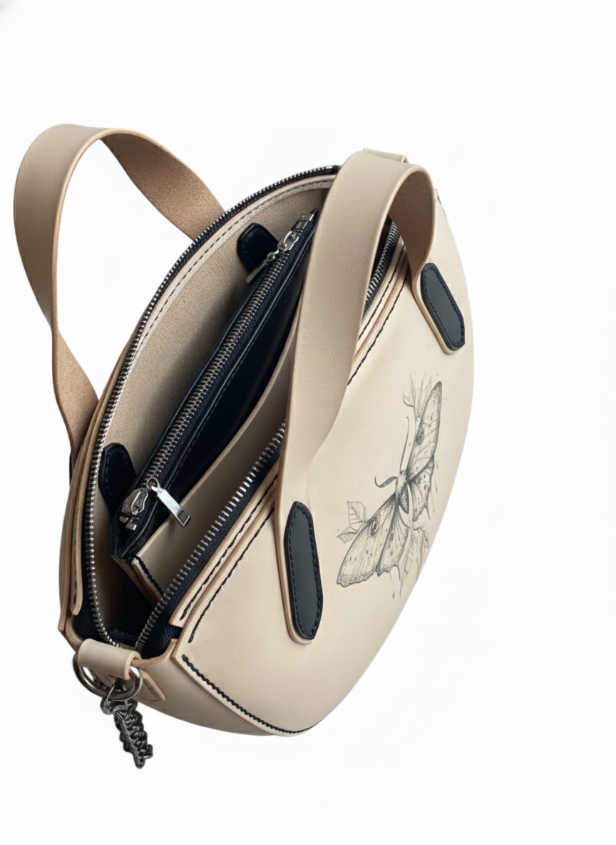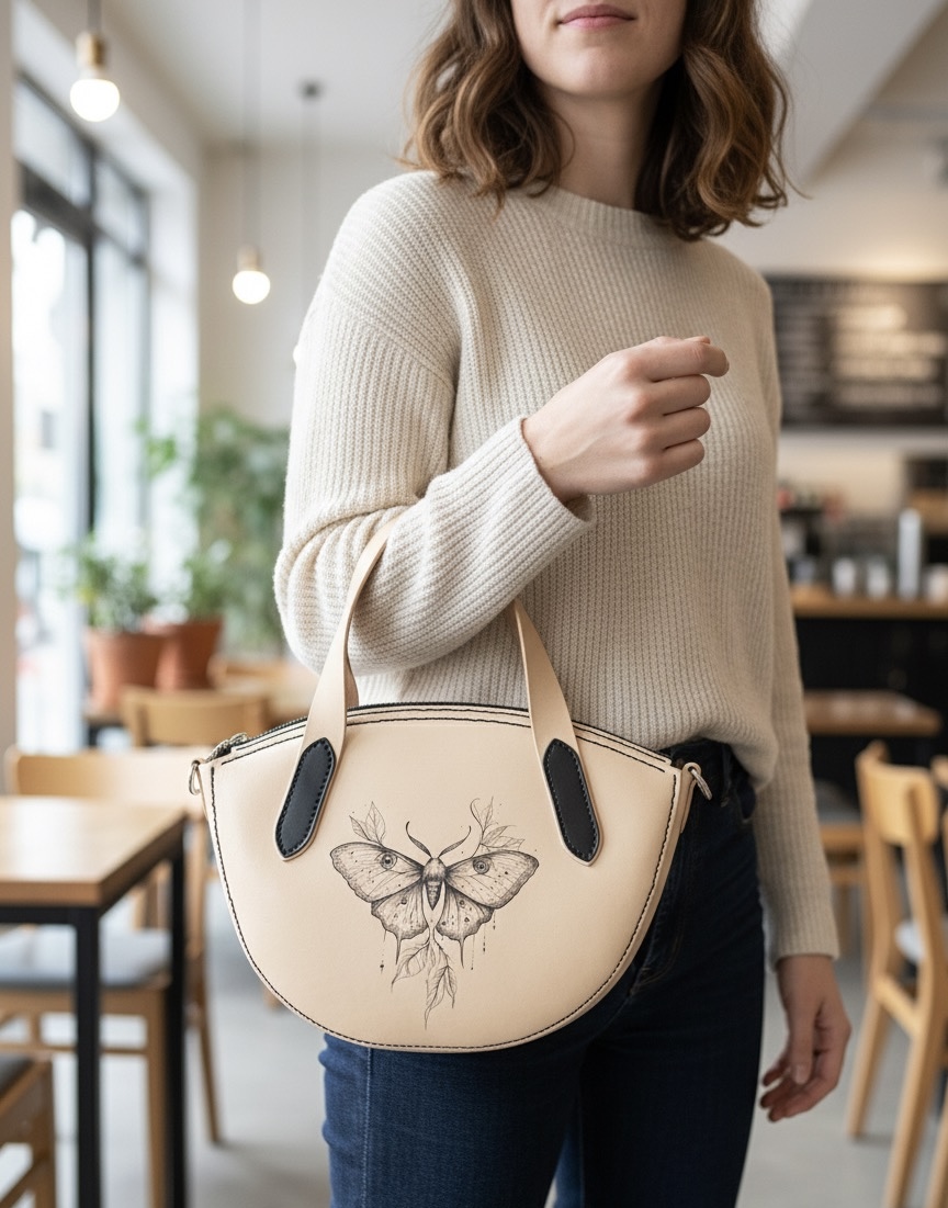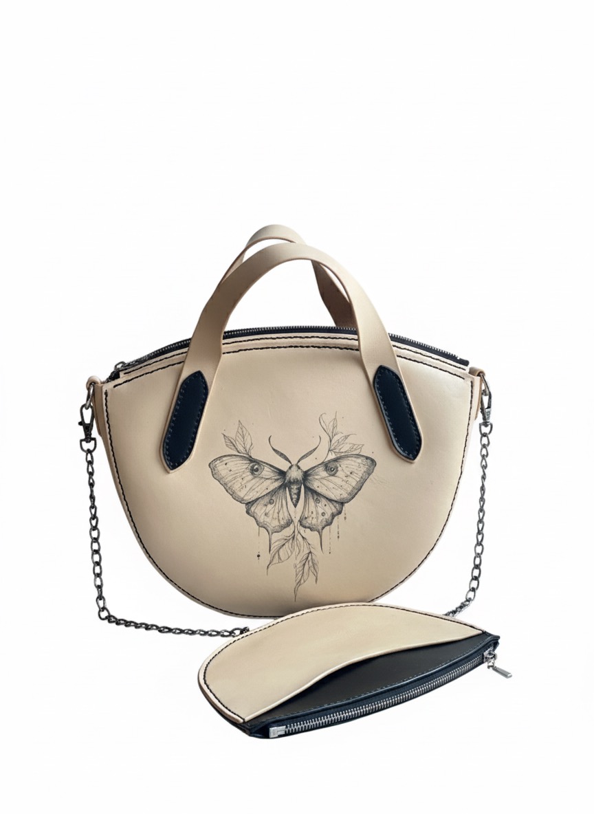 • Ručně tetovaný talisman: Centrální motiv majestátní můry je do kůže precizně ručně tetován. Tento detail dodává kabelce uměleckou hodnotu a mystický nádech, který je naprosto nezaměnitelný.