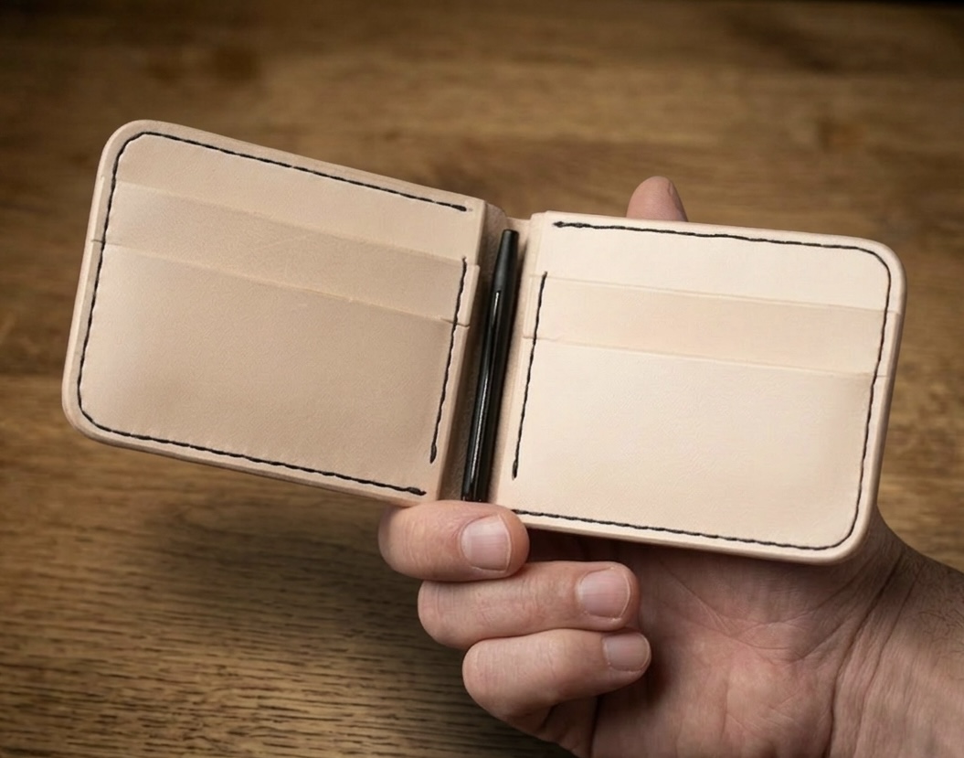 • Ruční práce a šití: Každý steh je proveden ručně pomocí tradičních sedlářských technik. Toto precizní ruční šití zajišťuje maximální odolnost a dlouhou životnost peněženky, která vám vydrží desítky let.