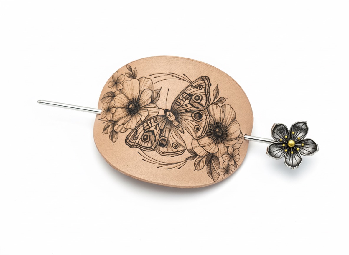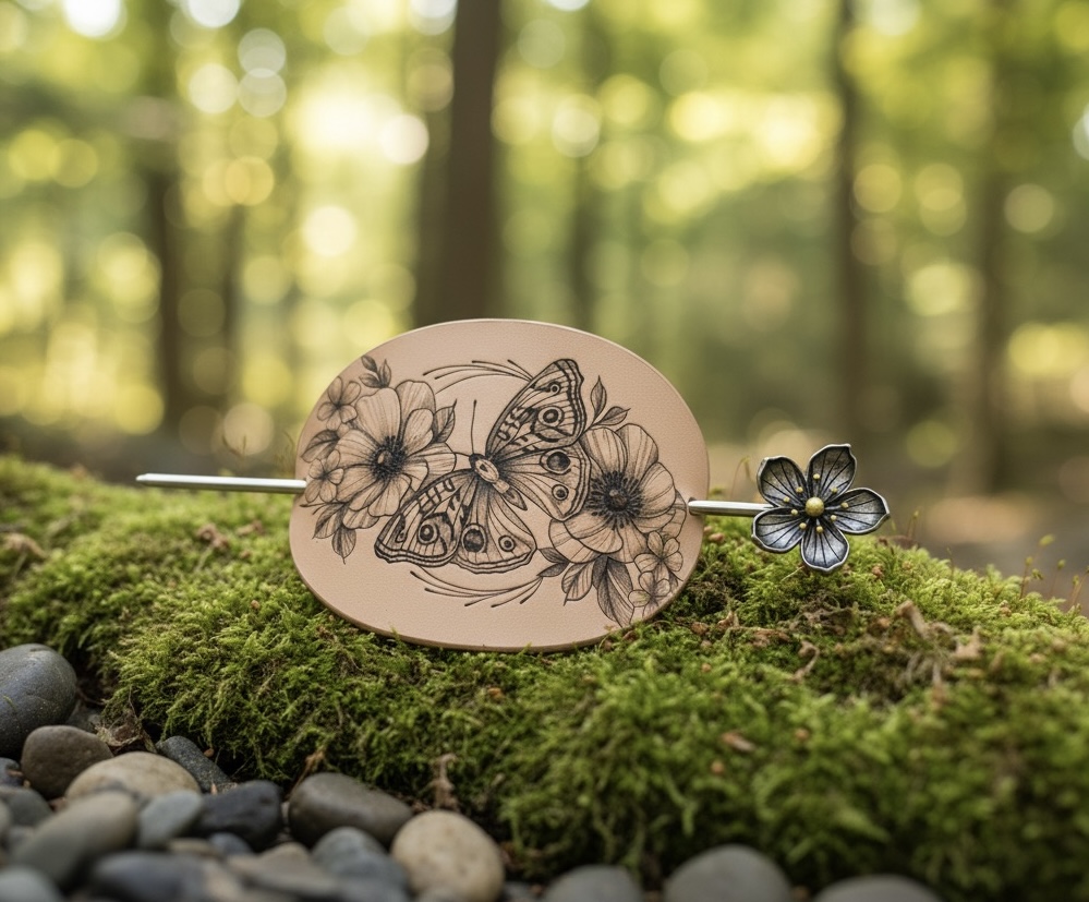 Představujeme vám unikátní vlasový doplněk, který v sobě snoubí sílu přírodní kůže a křehkou krásu kresby. Tato spona není jen kusem doplňku, je to malé umělecké dílo vytvořené s trpělivostí a láskou k detailu. Každý kus je originál, do kterého byla vložena duše ruční práce.